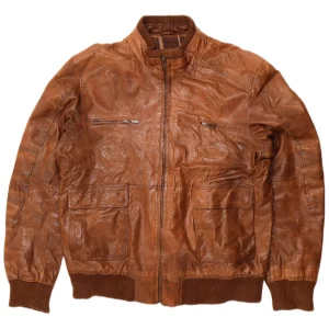 - Descripción de IA: This A.P.C. mens utility jacket is crafted from rich brown leather, offering a durable yet refined texture. It features a classic collared neckline and long sleeves. The regular fit ensures comfortable wear. A four-button front closure provides a traditional touch. Practical pockets enhance its utility design, blending classic style with everyday functionality. This piece is a timeless addition to any wardrobe.