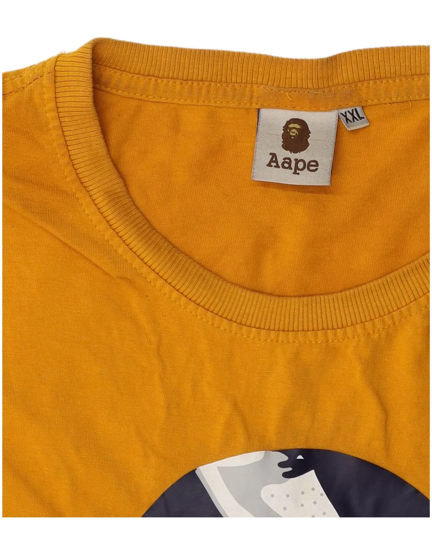 - Descripción de IA: This Aape men’s Graphic T-Shirt Top is crafted from soft yellow jersey fabric. It features a classic round neck and short sleeves. The regular fit ensures comfortable wear. A bold illustration print adorns the front, adding distinctive style. Subtle logo detailing completes the design, offering a signature touch. This top combines comfort with a contemporary aesthetic.