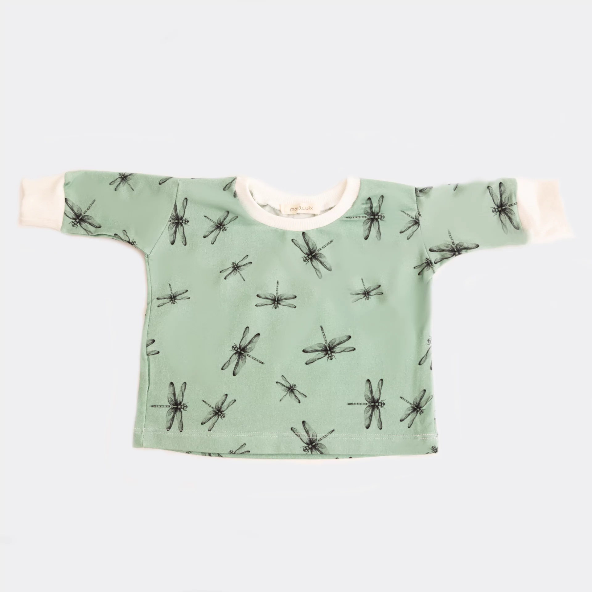 Sudadera 100% algodón orgánico de color verdoso con estampado estampado de libélulas, diseñada y fabricada a mano en Mallorca.